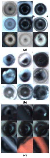 Figure 3 illustrates the larger size of the heat staking points grouped by quality. For the classification, this study manually grouped the images into three different categories. The images were collected with a camera with a resolution of 5 M and an effective number of pixels (H × V) of 2592 × 1944: Figure 3a shows good quality points, Figure 3b shows defected points, and Figure 3c shows unknown points. Unknown points consist of points that are either partially covered by other cables, or out-of-focus and blurred images. Because the images are small-sized and the differences between defects and non-defects are not large, deepening the neural network will lead to the gradient vanishing problem. Therefore, this study chose ResNet, as it has the advantage of solving the gradient vanishing problem while deepening the network. This is typically important in the inspection of the heat staking process because the heat staking points are extremely small compared with the door trim images.