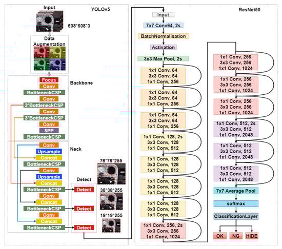 Among the YOLO series, this study used the most recent, YOLOv5, for detecting staking points from automobile door trims and the ResNet classification model for classifying the quality of detected staking points. This study ensembled two different methods to increase both the efficiency and accuracy of the given task. In this study, the function of YOLOv5 was to localize the abnormal regions surrounding staking points. The advantage of using ResNet is in avoiding gradient explosion problems in deep learning for classification. Using both models, this study dynamically filtered the result from the YOLOv5 and ResNet models. Because of several advantages, prior studies have well-used object detection models and classification models simultaneously in solving specific given tasks [1,12,13,14,15,16,17,18,19,20,21].