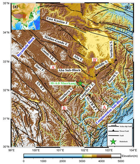 The Bayankala block, where strong earthquakes are concentrated in the Chinese Mainland, can be further divided into two sub-blocks by the Longriba fault: the Aba sub-block and the Longmenshan sub-block [32]. The Maerkang earthquake is an intra-plate earthquake within the Aba sub-block, which is usually of a smaller magnitude compared to earthquakes at plate boundaries. Tectonically, the Aba sub-block is surrounded by the Longriba Fault Zone to its east, the East Kunlun Fault to its northeast, and the Xianshui River Fault to its southwest, and its movement is strictly controlled by the three boundary faults [33]. The Longriba fault, located to the southeast of the epicenter, is almost parallel in the strike to the Longmenshan fault to the east of the epicenter and is 200 km apart, showing a right-lateral strike-slip and thrust nature [33], with a slip rate of ~7.5 mm/yr in the Late Pleistocene and ~2.1 mm/yr in the Holocene [34].