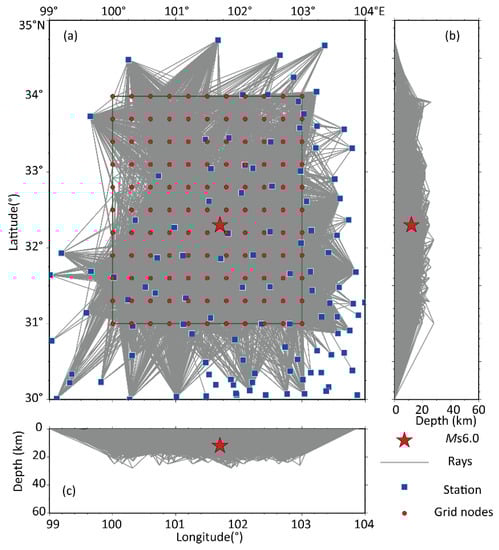 Station and three-dimensional ray distribution used in this paper. (a) shows the distribution of ray nodes in the horizontal area. (b) shows the ray distribution at latitude and depth. (c) shows the ray distribution in longitude and depth. (red five-pointed star represents the location of MS 6.0 main shock, the blue box represents seismic station, red origin represents the set of grid nodes, and the green rectangle represents the study area).