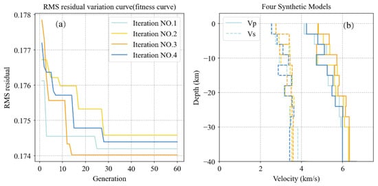 Our objective function is the minimum RMS residual of the VELEST method. Firstly, appropriate parameters are preset for EA, which are search algebra, N, population size, M, crossover probability, and mutation probability, . Among them, the search algebra is the optimal generation number, and population size is the number of parallel solutions for each generation. Then, the velocity parameters of the 1D velocity model are set as variables to be optimized, which are converted into chromosomes which are the coded representation of the individual in question in the form of a string. Then coded chromosomes to complete the initialization of the population . The parameters at different depths of each group of 1D velocity models correspond to an individual in the population and also to a . Then input the parameters corresponding to each chromosome in into the VELEST method, and calculate their RMS residual, which is also called target function . Next, calculate the probability of each chromosome being selected and choose them by roulette. For the selected chromosomes, they will be randomly paired and crossed at random points if and only if the random crossover probability is larger than . When and only when the probability of random variation is larger than , random variation occurs at the corresponding gene locus. After the above steps, a new generation of the population will be generated. Repeat the above process until the preset search algebra is reached. Finally, after iteration, the velocity corresponding to the minimum RMS residual value of the VELEST model output after model comparison corresponds to the best 1D velocity model found. Since it has been confirmed that excellent results can be obtained when searching the 60-generation population, Figure 3 shows the results of 4 runs of the 60-generation EA operation, which shows that the best 1D speed model obtained is robust. Specifically, Figure 3a shows four variation curves of the RMS residual change effect of 60 generations of EA iteration that can describe the average level of the model during the experiment. It can be seen from the figure that the RMS residual of the best 1D velocity model obtained by EA and VELEST methods are both around 0.1745, and the effect is robust. Moreover, Figure 3b shows the models’ P-velocity and S-velocity corresponding to the above four groups of parameters for comparison.