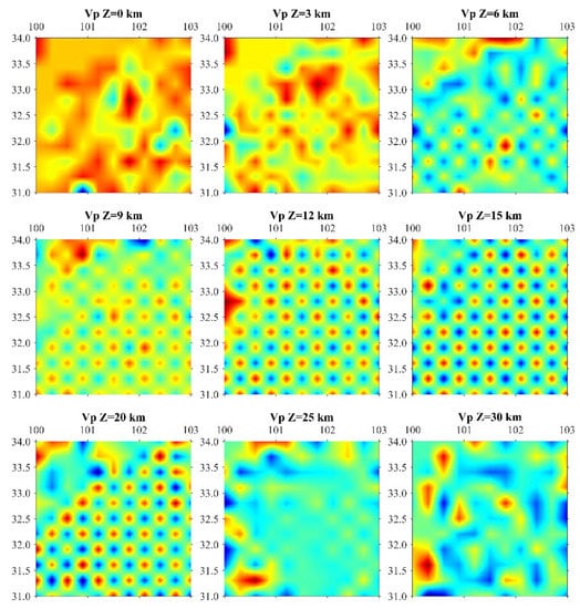 The accuracy test of inversion in this paper uses the checkerboard test method. This is the checkerboard results of P-wave velocity at different depth levels(0.3° × 0.3°). It can be seen from this figure that VP recovered well in the 6–20 km. There is slight trailing in the 3 and 25 km depth layers. At 0 and 30 km, the smearing is severe, and anomalies in the checkerboard are not expected to recover.