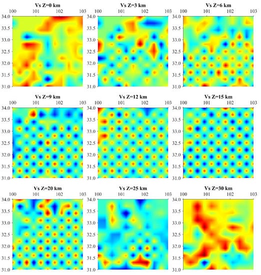 Checkerboard results of S-wave velocity at different depth levels(0.3° × 0.3°). Similar to the chessboard test result of P-wave, it can be seen from this figure VS recovered well in the 6–20 km. There is also slight trailing in the 3 and 25 km depth layers. At 0 and 30 km, the smearing is severe, and anomalies in the checkerboard are not expected to recover.
