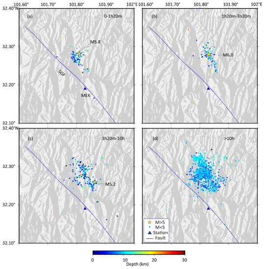 The time-space distribution of earthquakes can well depict the nature of earthquake-generating fault movement [47,48]. The spatial locations of the three MS 5.0 or higher earthquakes were shown in the precise relocation results: 0:03 MS 5.8 Maerkang earthquake: 32.28° N, 101.81° E, depth 12.3 km; 1:28 MS 6.0 Maerkang earthquake: 32.28° N, 101.83° E, depth 18.8 km; 3:27 MS 5.2 aftershock: 32.26° N 101.86° E, depth 19.45 km. Combined with the relocation epicenter distribution of this earthquake sequence shown in Figure 6, it is evident that the whole sequence tends to migrate southeastward and deeper within 10 h after the earthquake.