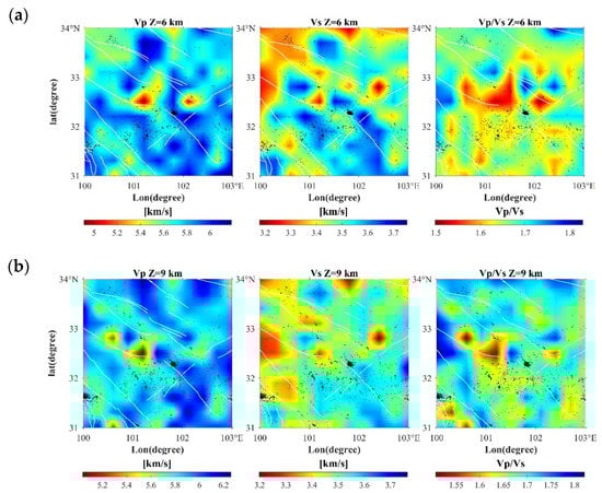 The wave velocity in the study area has significant lateral and longitudinal heterogeneity. The vertical distribution of both P and S waves shows significant undulation, which corresponds to the folded deformation of the strata in the study area [54]. In general, the tomography results of the P-wave and S-wave were relatively consistent. High-velocity anomalies dominate P-wave and S-wave at 6–9 km depth and low-velocity anomalies at 12 km–20 km depth. The significant low-velocity zone may be the range of fluid channels in the crust of the Qinghai-Tibet Plateau, and it is assumed that the material nature may be salt-bearing water fluid or local melt in the adjacent Ganzi area [55].