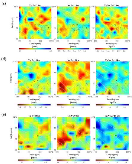 The maximum value of VP/VS calculated by the P-wave to S-wave velocity ratio is 1.86 at a depth of 15 km, and there are two places; one appears on the south side of the Xianshui River Fault in the southwest corner of the study area, and the other is located between the southern margin of the Gande Fault and the eastern end of the Dari Fault. The minimum value is 1.42 at a depth of 15 km, located at the site of the 1973 Luhuo MS 7.6 earthquake. The VP/VS values at 6 and 9 km depths exhibit multiple diamond-shaped masses, which may be related to the gravitational equilibrium in the local mountainous area. The location of the 12 km depth MS 5.8 Maerkang earthquake is surrounded by low VP/VS values and is located at the low-value boundary. The VP/VS values at 15–20 km depth are dominated by high values. Due to the low-speed characteristics of S wave propagation in the liquid, it is generally believed that high VP/VS values are related to saturated fluid [56,57,58,59]. In addition, the S-wave velocity at 15 km depth shows a wide range of S-wave anomalies combined with high VP/VS values that may exist in local melting [60].