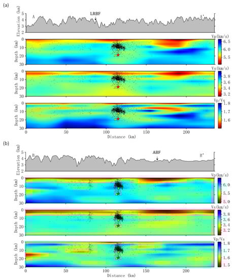 Three-dimensional velocity and seismic distribution along seismic strike and vertical profile. (a) represents the vertical imaging results of profile AA’, and (b) represents the vertical imaging results of profile BB’. (Black dots are seismic events, and earthquakes within 6 km around the profile line are selected; LRBF: Longriba fault; ABF: Aba fault).