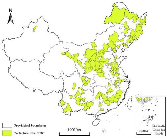 According to the ‘National Sustainable Development Plan for Resource-based Cities 2013–2020’ issued by the State Council in 2013, there are 262 RBCs nationwide in China, including 126 prefecture-level administrative regions, 62 county-level cities, 62 counties, 58 counties (including autonomous counties, forest areas, etc.), and 16 municipal districts (development zones or management zones). The study takes 112 prefecture-level RBCs as the research area; these RBCs account for 88.88% of the total number of prefecture-level RBCs and are the main body of the RBCs in China. The study areas are shown in Figure 1.