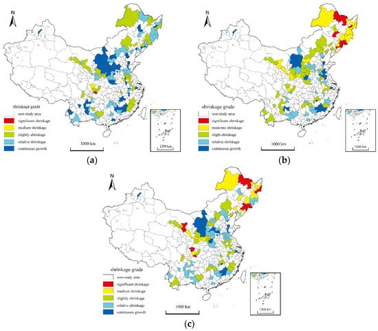Distribution of shrinking RBCs and changes in shrinkage grade in China: (a) 2000–2010; (b) 2010–2020; (c) 2000–2020.
