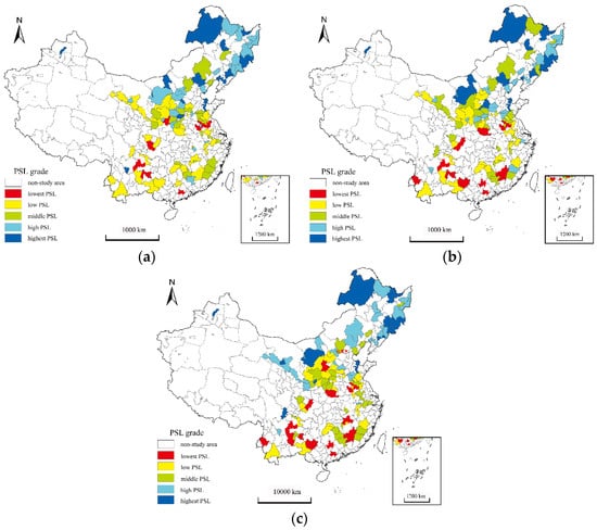 Spatial differentiation of PSL in RBCs in China: (a) 2000; (b) 2010; (c) 2020.