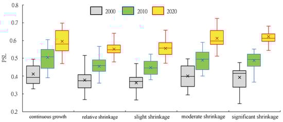 Figure 4 shows the PSLs of different shrinkage grades in 2000, 2010, 2020. The PSL of the continuous growth grade is highest in 2000 and 2010, while it dropped to the third place in 2020, and the significant shrinkage grade replaced the continuous growth grade as the highest PSL grade. The slight shrink grade PSL is the lowest in 2000 and 2010, while the relative shrinkage grade PSL is the lowest in 2020. The above shows that there is an enormous difference in the improvement of the PSLs for cities with different shrinkage levels. The internal differences of the PSLs in each shrinkage grade generally show a decreasing trend, with only a slight increase in slight shrinkage class during 2000–2020, but the decreasing trend slowed down significantly during 2010–2020.