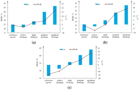 During the period between 2000 and 2020, the PSLIRs in the continuous growth grade and the relative shrinkage grade were 47.75% and 49.70%, respectively, while the PSLIRs in the slight shrinkage grade, the moderate shrinkage grade, and the significant shrinkage grade were 54.44%, 57.21%, and 61.74%, respectively. The pr and the PSLIR in the five shrinkage grades show an obvious positive correlation (Figure 6c), and the change trends of the two phases are generally consistent with the trends of 2000–2020 (Figure 6a,b). The correlation coefficients between the pr and the PSLIR for the five grades in the two phases and 2000–2020 were 0.88, 0.92, and 0.99, respectively, and were significant at a 0.05 level. This is a positive correlation between pr and PSLIR.