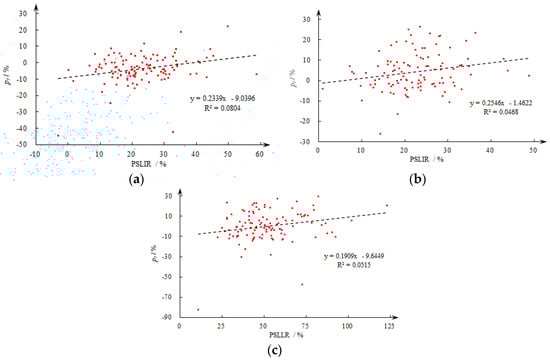 The analysis of the shrinkage grade may mask individual differences, and the individual differences need to be analyzed at the city scale. The correlation coefficients between the pr and the PSLIR of the 112 cities during 2000–2010 and 2000–2020 were 0.284 and 0.227, respectively (Figure 7a,c), and were significant at a 0.05 level. The insignificant correlation coefficient in 2010–2020 was caused by three cities, Guang’an, Anshun, and Liupanshui; the correlation coefficient after excluding the above three cities was 0.216 (Figure 7b), which is similarly significant at a 0.05 level. There is a positive correlation between the pr and the PSLIR at both the shrinkage grade and the individual city scale.