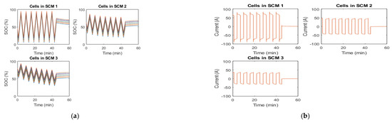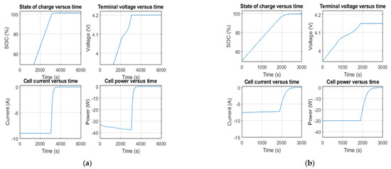 As shown in Figure 1, SOC increases over time linearly in the constant-current portion during a test, while SOC still increases but not as quickly after switching to the constant-voltage portion. Therefore, the graph’s slope possesses a nonconstant value as SOC steadily proceeds to desired final values. The above result is also manifested as one reason that the system charges rapidly until 80–90%, before taking a long time to reach 100% SOC or exceeding the manufacture voltage of the cell. The first interval current remains constant in the graph, demonstrating the relationship between power and time. However, the magnitude of power increases with an increase in voltage. The magnitude of power increases with an increase in voltage. In the second interval, the current magnitude continuously decreases; hence, the power magnitude decreases over time. The sign value increases, but the magnitude decreases.