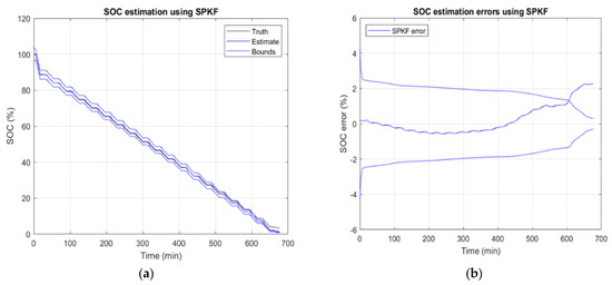 Ref. [101] demonstrated the implementation of EKF on the ESC model (Figure 6a,b; simulation data adopted from [101]). The author performed a test where EKF was executed for dynamic profiles (UDDS drive cycles separated by rest intervals) from 100% SOC to 3.3% SOC. The RMS error calculated for SOC estimation in the second figure was 1.53%, whereas the time error outside bounds was 35.9%. The test achieved 50 C with nonlinear hysteresis in cell voltage. A better estimation was possible with an increase in temperature. The SPKF was implemented using the same model and data, and the estimation RMS error was 0.84% (Figure 7a,b). The estimation error was within the bound of the SPKF filter 10.5% of the time. This result of SPKF with compared to EKF is remarkable.