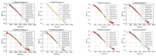 The most conventional machine learning algorithms are regression, instance-based, regularization, decision tree, Bayesian, clustering, and association rule learning algorithms. On the basis of above classification, PyCaret was applied for model selection and fine-tuning to decide the best machine learning algorithms according to DST drive cycle data of NCR 18650B. A laboratory test was conducted to retrieve DST drive cycle data. Time, current, voltage, capacity, and SOC were measured with different temperatures. The PyCaret automation tool performed the simulation on DST drive cycle data (time, current, voltage, capacity, and SOC) to choose suitable ML algorithms for SOC estimation. The PyCaret automation tool came up with 21 algorithms (Table 6 gives the best SOC estimation solution for different drive cycle data on different Li-ion batteries. In Figure 9, the best algorithms among the 21 ML algorithms (random forest (RF), linear regression (LR), decision tree (DT), extra trees regressor (ETR), support vector regression (SVR), k neighbor regressor (KNN), extreme gradient boosting (EGB), and adaBoost (AB)) were chosen for SOC estimation according to accuracy, computation time, error rate, and performance. Non-model-based state estimation is reviewed in Table 7.