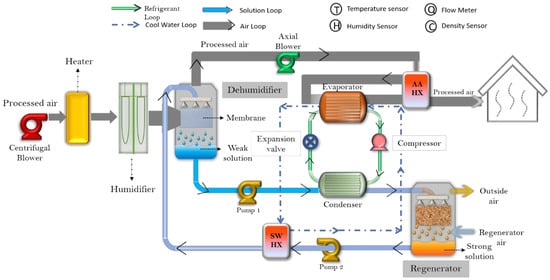 Air conditioning (AC) is acknowledged as a crucial means of upgrading the comfort level and living environment for humans, as people spend up to 70–90% of their lives indoors. The parameters for better indoor air quality include airborne pollutants, ventilation, thermal comfort, humidity, acoustic conditions, and other variables [1]. Usually, thermal comfort and humidity are the two important factors that are regulated by AC systems. It is anticipated that, in the future, AC systems will need more energy to provide a comfortable indoor environment due to the rising demand for a high quality of life [2]. Hence, improving the effectiveness of AC systems is consequently a prominent topic of discussion. Moreover, worries about global warming and other forms of environmental degradation have increased the demand for buildings to reduce their cooling and air conditioning energy use [3]. In recent years, the vapor compression system (VCS) has gained popularity due to its compact size, the ability to handle sensible heat load effectively with high heat transfer, and operation convenience [4]. However, it has always been criticized for its significant dependence on electricity, inadequate humidity control, and ineffective handling of latent heat load as supercooling is done below its dew point temperature and afterward reheating is done to the desired indoor condition, which results in significant energy consumption. In addition, health issues might arise because the coil surface in the VCS can act as a fertile source for microorganisms due to the condensed water. Therefore, a persistent effort has been made by the researchers to search for better alternative AC systems.