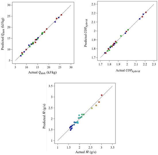From Table 5, it can be observed that there is a major change in all responses for each combination of experimental runs. From the results, it can be observed that with an increase in inlet air flow rate, desiccant concentration, and specific air humidity, all three responses (, , and ) will increase. Moreover, the same effect of the inlet desiccant temperature is observed on and , whereas by increasing the inlet desiccant temperature, the is reduced. Furthermore, from experimental run 13, it can be observed that the maximum values of and are obtained with a minimum level of , and a maximum level of , . On the other hand, the minimum values of and are obtained with a maximum level of and and a minimum level of and (i.e., run 4). For the 3rd and last response, i.e., , the maximum value is obtained with the maximum level of , , and and a minimum level of (run 14). On the other hand, the minimum value of is obtained with the minimum levels of , , and and the maximum level of (run 3). Therefore, from the selected above-mentioned experiment runs, the following input variable levels can be selected to obtain optimal output responses.