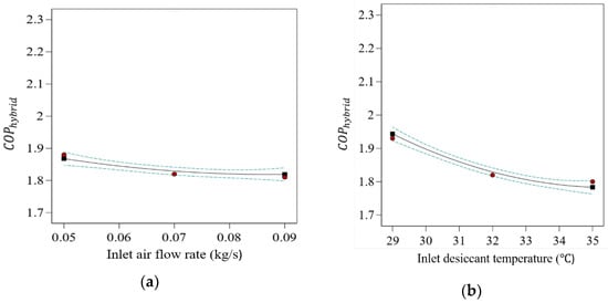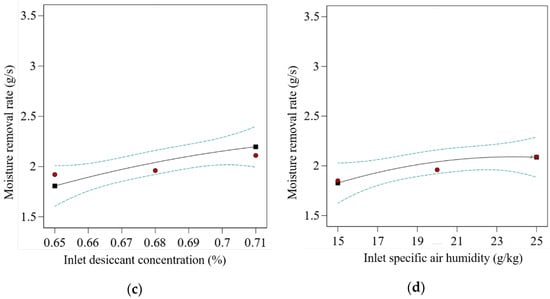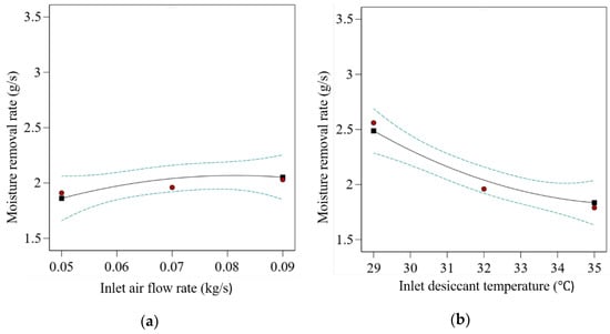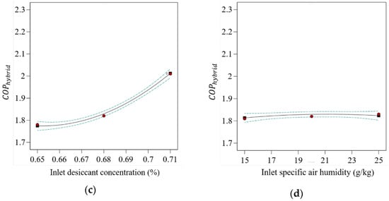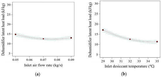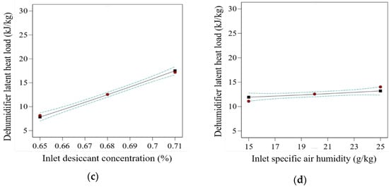 Figure 5 illustrates the effect of independent variables on the response. From the results, the maximum value of is observed at the lowest values of and . However, the highest values of and yield the maximum value of . The reason behind the higher heat removal rate at lower air flow rate is due to the fact that the contact or interaction time increases between inlet air and liquid desiccant, which leads to significant MRR compared to high inlet air flow rates. Similarly, at a low inlet desiccant solution temperature, the capacity to absorb moisture content by the solution will be high due to the higher driving force. At an optimal level of mass concentration of desiccant solution, it will be more likely to execute its intended function. Moreover, with the increasing humidity level of inlet air, the value of the dehumidifier’s latent heat load will increase. The effect of input variables on the response can be seen as a quadratic (p-value < 0.001) term with all four input variables. Similar behavior of the input variable is found in the literature [26,42,43]. Furthermore, from the sum-of-squares values as shown in Table 7, a noteworthy significance level of response is shown. The highest contribution among linear terms of the input variables is that of , with a 65.27% contribution. The square interaction term has the highest contribution, with 1.17% contribution. The cross-interaction term has only 0.58% contribution.