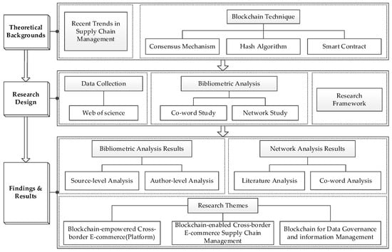 With the rapid development of digital transformation and internet-based technology, there is an increasing trend of online shopping, contributing to the booming development of the e-commerce industry. The cross-border e-commerce facilitates access to products and worldwide service, and it has become a prevailing consumption form in the Chinese market, driven by the diversified e-commerce platform, modern logistics distribution systems, and effective operations management [1,2]. An important feature of cross-border e-commerce is the worldwide network; regardless of place, one can participate in electronic shopping. However, there are still some inevitable obstacles hindering the development of cross-border e-commerce due to the discrepant cultures and habits, and the fast delivery to online consumers is one of the crucial factors for further development of cross-border e-commerce due to time-consuming international logistics [3,4]; The long-distance transportation is usually time-consuming for cross-border e-commerce business [5]. The effective supply chain management innovation practices contribute to performance improvement of cross-border e-commerce due to effective operations management [6,7,8,9]. It will be regarded as a triumph for cross-border organizations that have a developed logistics network and a high efficiency distribution system [6,10,11,12]. For the cross-border supply chain management, the trust problem is a key issue due to multiple participants. Due to the discrepancies in terms of cultures, legal provisions, and consumption habits of different countries and regions, it is difficult to establish a stable and reliable alliance for all participated parties [13]. With the technological development and the changing consumer awareness, the core of competition in cross-border e-commerce has changed from the basic attributes of goods, such as quality and cost, to the after-sales service ability of merchants to customers, namely the service ability of the supply chain [14,15,16,17,18,19]. To improve the performance and efficiency of cross-border e-commerce, efficient management of the segmental elements of business flow, logistics, and capital flow should be integrated efficiently. The development of management service capacity of the supply chain is based on these three sectors and their effective interactions [20]. Blockchain technique, as a crucial technology enablement, could significantly improve the efficiency of supply chain management by innovative management practice and further promoting the development of cross-border e-commerce [21]. Therefore, there is great significance and research value in studying the relevant literature of blockchain technology enabling cross-border e-commerce supply chain management for exploring the development status and further exploring problems.
