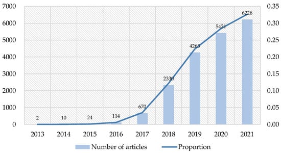 The previous publications related to blockchain and cross-border e-commerce supply chain management are collected to be the research samples. The Web of Science is crucial for accessing global academic information [65]. In order to further understand the development trend of blockchain in the field of cross-border e-commerce, this paper selected the core database of Web of Science as the database [66]. It includes more than 1300 authoritative and high-quality academic journals from around the world in the fields of natural sciences, social sciences, biomedicine, arts, and humanities. Furthermore, it easily tracks the origin and history of research documents or the latest developments in a field on the Web of Science. A total of 19,062 research papers published from 2013 to 2021 were searched using “blockchain”, “cross-border e-commerce”, and “supply chain management” as the keywords.