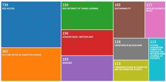 In order to analyze academic research papers about blockchain, we selected the related papers from the core database of Web of Science by searching “blockchain”, “cross-border e-commerce”, and “supply chain” keywords [77]. There are 19,062 references collected in this bibliometric analysis. We found that academic research about blockchain has occurred since 2013, keeping an increasing tend until 2021. As can be seen from Figure 1, although studies on blockchain began to appear in 2013, the number of studies was pitifully small in the following two or three years. Since 2016, the number of relevant studies has grown rapidly, and the fastest growth is from 2018 to 2021. The distribution of collected research articles is shown in Figure 2. We can speculate that blockchain is developed with the emergence of new data such as the Internet of Things and big data, which is related to the characteristics of blockchain technology [78]. We also find that the large-scale research and application of blockchain is related to the emergence of some new technology. Figure 3 shows the number of publications on blockchain in recent years. Figure 3 shows the top 10 journals including research papers. The top three publications were IEEE Access, Lecture Notes in Computer Science, and Sustainability. The number of publications is more than 110, which have become the hotter journals in this field. Through the depicted diagram, we find that the research directions of journals include computer science, business economics, communication, telecommunications, mathematics, government law, and so on. This shows that the research about blockchain has been gradually extended from the research about technology to the research on application of blockchain in different fields.