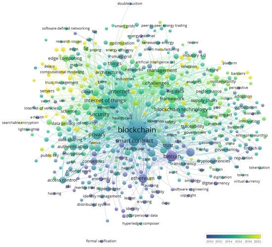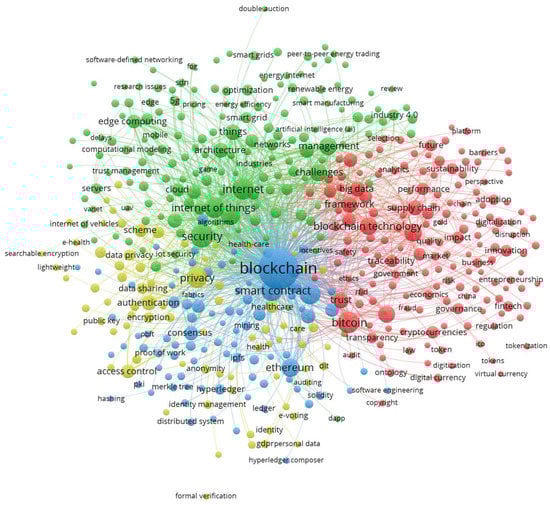Co-word analysis was proposed by Turner et al. (1988) and Callon et al. (1991) in the 1980s [72,73]. It is used to analyze the research status of a certain field and has strong advantages and credibility, which includes factor analysis, strategy analysis, and network analysis. Co-word analysis is a content analysis method, which mainly selects a large number of common keywords in the literature and makes hierarchical clustering of these representative words based on them, so as to reveal the relationship between these words and the research trends of the disciplines represented by them. Co-word analysis has great applicability in different fields due to its advantage in finding overlapped research. To help better understand this topic, the VosViewer analysis is employed to draw a keyword co-occurrence network diagram to explore the evolution of blockchain technology, contributing to summarizing the overall development trend and future research opportunities [72,74].