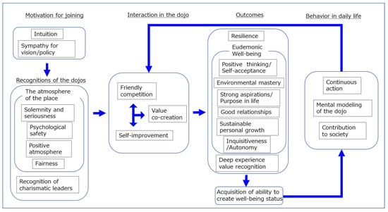 We identified resilience, eudemonic wellbeing, and deep experiential value recognition as outcomes that can be obtained through the interactions that occur during dojo practice. The results suggest that, by experiencing or acquiring these outcomes, the participants developed the ability to create a state of wellbeing, share it with their peers, contribute to their personal growth by changing their way of life, and influence the external environment.