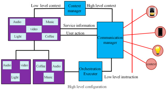 The information from the sensors (the low-level context) is sent to the Context Manager, which reasons and infers high-level context, which is then forwarded to the Composition Manager. For example, a sensor related to the Bluetooth protocol will detect a smartphone’s presence. Then, the Context Manager identifies the owner of the smartphone and the location where the sensor is located (for example, the sensor is in the bedroom, and Kamran owns the smartphone). Hence, high-level context information is easily obtained (Kamran is in the bedroom). In addition to the data obtained in the high-level context, the composition manager will be able to obtain information about different system applications. Also, as seen in the Figure 3, the services that belong to the same family are grouped in a box. (e.g., light, sound, video, etc.). Therefore, smart home users can categorize new compounds in different packages based on this method. Finally, the composition needs to be enforced for the various services. The Orchestration Executor is responsible for converting the information of the different blocks into service-specific implementations. This conversion is only possible if the ontologies of the services contain enough information about their control and data flow.