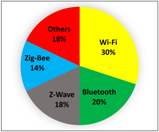 Smart home communication protocols are divided into wireless and wired groups based on the communication platform. Wired communication protocols are less diverse due to the need for peripheral hardware. One of the most significant developments in Europe in recent years in the field of smart home technology is the development of the KNX/EIB protocol for home automation [35]. KNX is an internationally recognized standard for smart home implementation and control [36]. The European Standard for Electronic Standardization (CENELEC) recently introduced the KNX standard in the EN 50,090 series, which became the international standard ISO/IEC 14,543 in July 2006 [37]. According to research, around 12 million KNX devices have been installed worldwide, more than 500,000 devices are compatible with this standard, and the organization controlling the features of this standard is formed by more than 150 members, including Siemens and Schneider. KNX enables connections using twisted pairs, power lines, and wireless and Ethernet links, and the range of sectors and applications that can benefit from this standardization is wide. There are also different types of wired protocols, such as Ethernet, X10, and UPB, which, in addition to increasing security, have disadvantages such as setup problems, incompatibility with products, and poor encryption. The emergence of the IoT has witnessed tremendous success in the application of wireless sensor networks and pervasive computing for various applications [38]. In general, wireless sensor networks have more advantages than traditional wired networks, including a high reliability, easy setup and installation, and increased productivity [39]. Also, recent electronics and wireless communication advances have made it possible to design and manufacture sensors with low power consumption, small size, reasonable price, and various applications. These small sensors can perform actions such as receiving multiple types of environmental information (based on the type of sensor), and processing and sending that information, causing people to replace traditional wired networks with wireless networks [40,41]. Of course, with the expansion of smart homes in recent years, wireless network technology has also faced challenges that have delayed its widespread adoption [42]. As shown in Figure 4, when it comes to home automation systems [43], Bluetooth [44], Zig-Bee [45], Z-wave [46], and Wi-Fi [47] are among the most widely used protocols that users use to communicate. According to the statistical graph shown, these four protocols have the largest share in terms of application compared to other protocols. Also, according to the chart, the remaining 18% includes protocols such as LoRaWAN, 5G, 6LoWPAN, etc., which will be explained below. These protocols are generally connected to devices or peer-to-peer networks. They can be used independently, share their sensor data, or, if necessary, store their data permanently on a local server save [48].