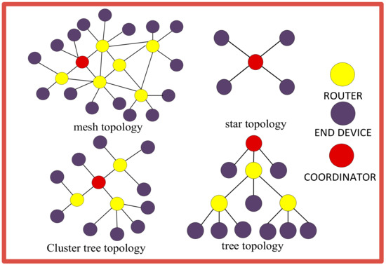 The EEE802.15.4 standard can support four types of topological networks with more than 64,000 nodes, two of them being star-tree-cluster-tree and star-mesh; however, Zig-Bee is only able to use tree topology [76,77]. Mesh topology, as a peer-to-peer network, consists of a coordinator and several routers and nodes. In this topology, it is easy to add or remove a device in the web, and if a problem occurs during data transmission in one path, the node finds another way and reaches the destination [78,79]. Also, in this topology, energy consumption is more optimal because the devices are close to each other. In a star topology, there is no router, although there is a coordinator and several end devices. One of the disadvantages of this topology is that, if the coordinator fails, the entire network becomes inactive. Since there is no alternative path from the source to the destination, the coordinator suffers. Cluster tree topology is a particular case of tree topology in which parents, together with their children, are called a cluster. [80]. In a tree topology, the network consists of a central node that includes a coordinator, several routers, and nodes. According to Figure 7, this topology consists of several star networks. To form a tree topology, at least three hierarchical levels must be created: a coordinating device, a router, and an end device. Child end devices and coordinators are called producer routers. In general, a topology A tree is used in the construction of large networks, and the management and maintenance of computers are easily possible. In this topology, if the central device is damaged, the entire network will fail, which is one of the disadvantages of this topology.