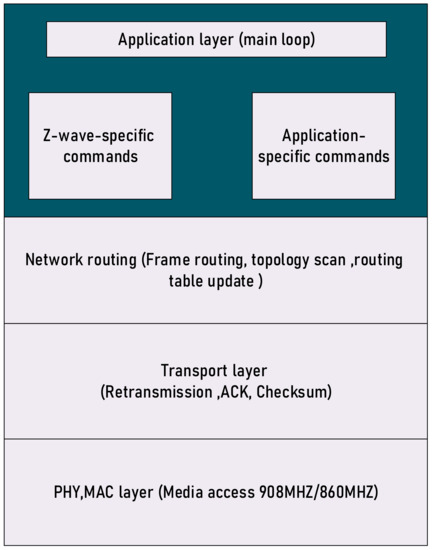 With the evolution of state-of-the-art applications and paradigms, the world is progressing toward smart cities. Smart homes are an important aspect of smart cities, wherein various mobile computing and network technologies are used. However, they are also susceptible to security threats that can cause serious issues related to privacy and safety. Z-Wave is a wireless technology that is primarily used in smart homes [81]. The Z-Wave protocol was started by the Danish company Zany’s as a smart lighting control system for consumers and evolved into a home network automation mesh protocol implemented on a SOC-on-a-chip system [82]. This protocol was created in 2008 by Sigma designs company to replace other protocols, and it is now one of the most widely used protocols. Z-Wave technology is a technology of low-power radio waves developed to establish communication between household devices. Z-Wave was described as a new wireless home automation technology that uses low power and communicates at a frequency of 900 MHz and a range of about 30 m. Reference [83] describes how Z-Wave can work in a smart home system. Further studies have been conducted to implement Z-Wave in specific applications such as monitor systems [84] and lock systems [85]. In addition, some authors have also focused on the security features of Z-Wave [86,87]. Z-wave devices have higher security due to the identification of the user and are also compatible with devices of different brands and can communicate with them [88]. The Z-Wave network supports mesh network topology, and a primary controller and several sub-controllers are responsible for establishing secure communication between devices [89]. In such a network, devices can communicate with each other through intermediate nodes and, in this way, communication barriers and blind spots are eliminated. Z-Wave technology consists of three layers: the radio layer, the network layer, and the software layer. These three layers are connected to lead to a robust and secure network [90]. Figure 8 shows the architecture of this protocol.