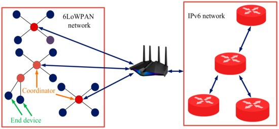 In this section, we will examine the nature of a 6LoWPAN protocol. This technology can support star and mesh topologies and 16-bit and IEE-EUI64-bit extended addresses [108]. Figure 12 shows the complete essence of this technology. As shown in the figure the 6LoWPAN gateway, located between two different networks, has the task of accurately implementing the matching layer function [109]. In the next part, the devices of this protocol, which are FFD and RFD, are examined. FFD devices can communicate with RFD devices and multiple FFD devices. These devices operate in three modes: a PAN coordinator, a coordinator, or an end device. RFD devices, unlike FFD devices, will only work as an end device, will only be able to communicate with an FFD, and are generally used for straightforward applications.