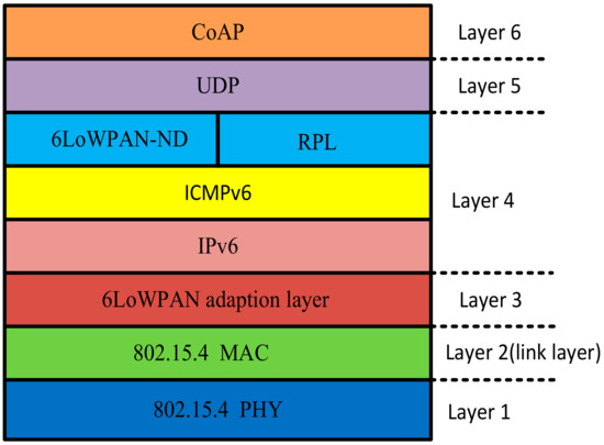 Figure 13 shows the 6LoWPAN protocol stack. According to the figure in Layers 1 and 2, MAC and PHY transmit the frames to the neighbors of the single hub. In Layer 3, it is necessary to fragment IPv6 packets and finally compress them; the reason for this problem is the limitation of 6LoWPAN protocol transmission (127 MTU). On Layer 4, 6LoWPAN neighbor discovery (6LoWPAN-ND) [110] disseminates context information for compressing arbitrary IPv6 network prefixes. Apart from this, 6LoWPAN-ND is a multi-hop version of IPv6 neighbor discovery and IPv6 stateless auto-configuration. Also, in Layer 4, the IPv6 Routing Protocol for Low-Power and lossy Networks (RPL) [111] routes IPv6 packets. On Layer 6, User Datagram Protocol (UDP)-based protocols, such as the Constrained Application Protocol (CoAP), are commonly employed.