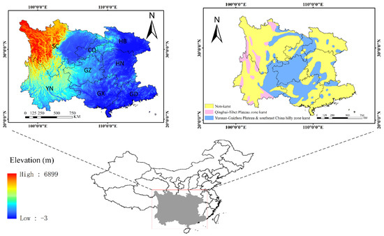 The study area is located in Southwest China, covering the entire karst region of southwestern China and including eight provinces, i.e., Yunnan (YN), Chongqing (CQ), Sichuan (SC), Guangxi (GX), Hubei (HB), Guizhou (GZ), Hunan (HN), and Guangdong (GD) (Figure 1). This area has a tropical and subtropical monsoon climate, and the elevation generally increases from east to west. The highest point bordering the southeastern part of the Qinghai-Tibet Plateau is close to 6700 m above sea level, and the other areas are generally less than 3000 m above sea level.