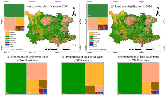 Spatial patterns and statistics of land use classification in southwestern China in (a) 2000 and (b) 2020, and the statistics of land cover types in (c) Non-karst, (d) QT Karst, and (e) YG Karst areas.