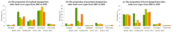 The proportion of (a) cropland, (b) grassland, and (c) forest changed into other land cover types in Southwest China from 2001 to 2005 (dark green bar), from 2006 to 2010 (light green bar), from 2011 to 2015 (yellow bar), and from 2016 to 2020 (orange bar).