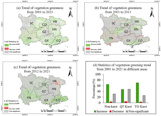 Spatial patterns of vegetation greenness trends in terms of LAI in Southwest China from (a) 2001 to 2021, (b) 2001 to 2011, (c) 2012 to 2021, and (d) the statistics of vegetation greening trend from 2001 to 2021 in Non-karst, QT Karst, and YG Karst areas.