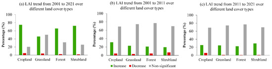 However, there might be a time lag between the implementation of ecological projects and vegetation growth, given that a large number of ecological projects to restore vegetation and alleviate rocky desertification have been implemented since the end of the 20th century [18,43]. Over the same period, climate change and human activities also had significant impacts on vegetation growth and the ecosystem as a whole [13]. During the period from 2001 to 2011, there were still some areas showing a decreasing trend in LAI. These areas were consistent with the areas and patterns of rocky desertification observed in previous studies [18]. While the greening trend was more obvious after 2012. In addition, small parts of areas show a significant and continuous trend of greening in both time periods (2001 to 2011 and 2012 to 2021) in all the four main land cover types of croplands, grasslands, shrublands, and forests (Figure 5). As most of the regions with a greening trend are undergoing a natural, creeping recovery process. The restoration of natural vegetation generally includes several successional stages, i.e., grass, grass-shrub, shrub, tree-shrub, and forest [22]. In this karst region, the transformation from a grassy community to a forest generally takes 30–50 years [22,65]. Considering that the area of reforestation was still limited [66], natural succession was dominant because of the geological background limitations [22].