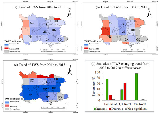 Spatial patterns of TWS trend in Southwest China from (a) 2003 to 2017, (b) 2003 to 2011, (c) 2012 to 2017, and (d) the statistics of TWS changing trend from 2003 to 2017 in Non-karst, QT Karst, and YG Karst areas.