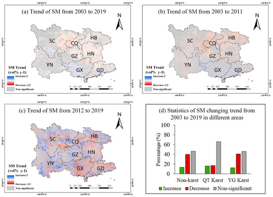 Spatial patterns of SM in Southwest China from (a) 2003 to 2019, (b) 2003 to 2011, (c) 2012 to 2019, and (d) the statistics of SM changing trend from 2003 to 2019 in Non-karst, QT Karst, and YG Karst areas.