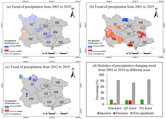 Spatial patterns of precipitation in Southwest China from (a) 2001 to 2019, (b) 2001 to 2011, (c) 2012 to 2019, and (d) the statistics of precipitation changing trend from 2003 to 2019 in Non-karst, QT Karst, and YG Karst areas.