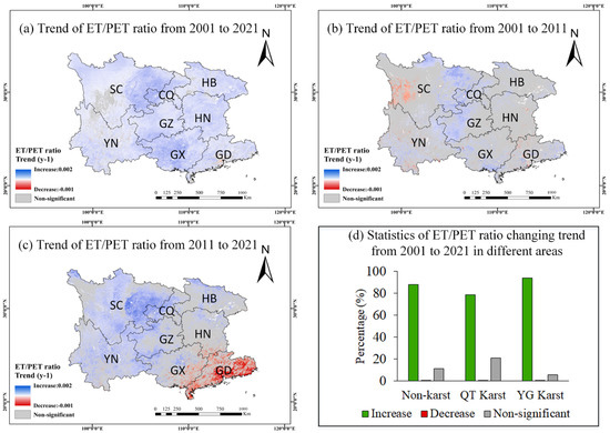 Spatial patterns of ET/PET ratio in Southwest China from (a) 2001 to 2021, (b) 2001 to 2011, (c) 2012 to 2021, and (d) the statistics of the ET/PET ratio changing trend from 2003 to 2019 in Non-karst, QT Karst, and YG Karst areas.