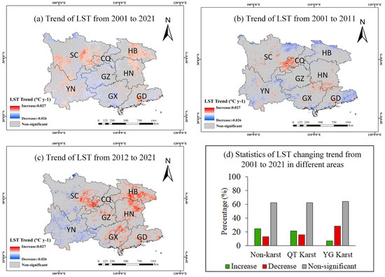 Spatial patterns of LST in Southwest China from (a) 2001 to 2021, (b) 2001 to 2011, (c) 2012 to 2021, and (d) the statistics of the LST changing trend from 2003 to 2019 in Non-karst, QT Karst, and YG Karst areas.