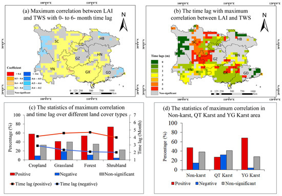 Spatial patterns of maximum correlation between LAI and TWS with (a) a 0- to 6-month time lag, (b) the corresponding time lag, and the statistics of maximum correlation and time lag for (c) different land cover types and (d) different karst areas in Southwest China.