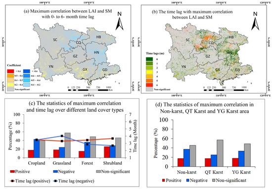 Spatial patterns of maximum correlation between LAI and SM with (a) a 0- to 6-month time lag, (b) the corresponding time lag, and the statistics of maximum correlation and time lag for (c) different land cover types and (d) different karst areas in Southwest China.