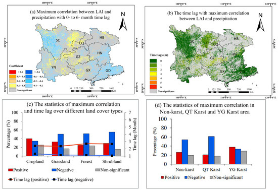 Spatial patterns of maximum correlation between LAI and precipitation with (a) a 0- to 6-month time lag, (b) the corresponding time lag, and the statistics of maximum correlation and time lag for (c) different land cover types and (d) different karst areas in Southwest China.