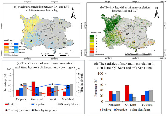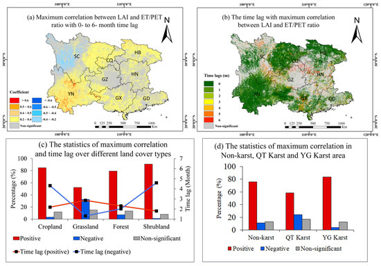 Spatial patterns of maximum correlation between LAI and the ET/PET ratio with (a) a 0- to 6-month time lag, (b) the corresponding time lag, and the statistics of maximum correlation and time lag for (c) different land cover types and (d) different karst areas in Southwest China.