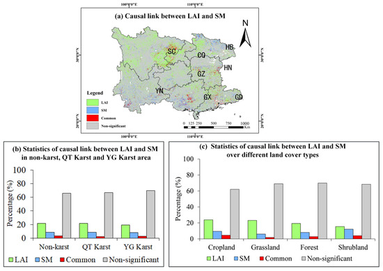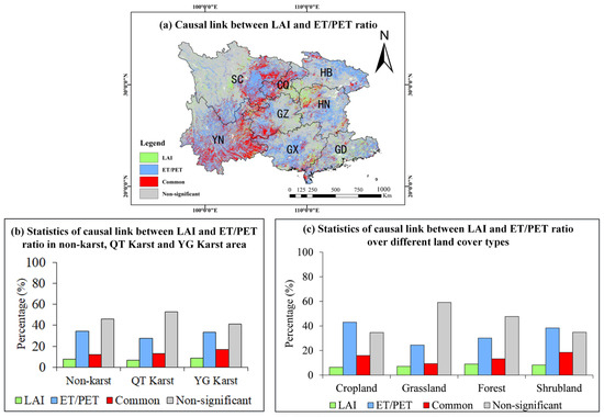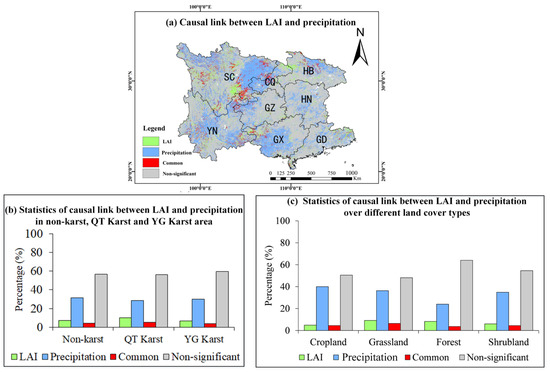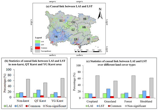 (a) Spatial patterns and statistics of the causality relationship between LAI and LST over (b) different karst areas and (c) different land cover types in Southwest China. The red indicates bidirectional causal relationships between LAI and LST; the blue indicates that LST is the unidirectional cause of LAI; the green indicates that LAI is the unidirectional cause of LST; the grey shows that there are no significant causal links between them.