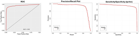 ROC curve (left), Precision curve (middle), and Sensitivity/Specificity curve (right) of RF model.